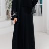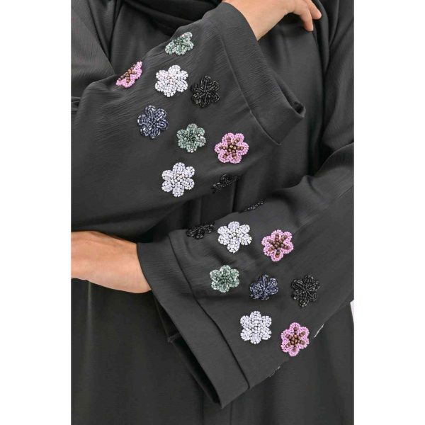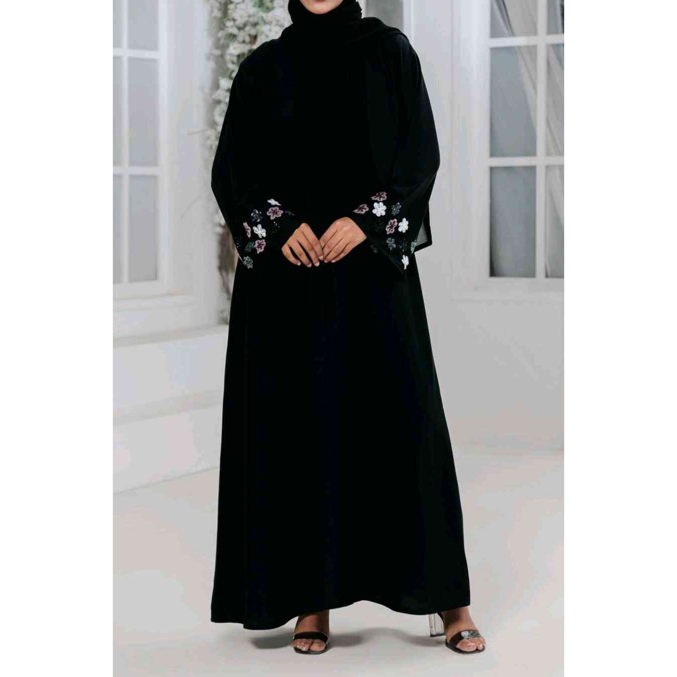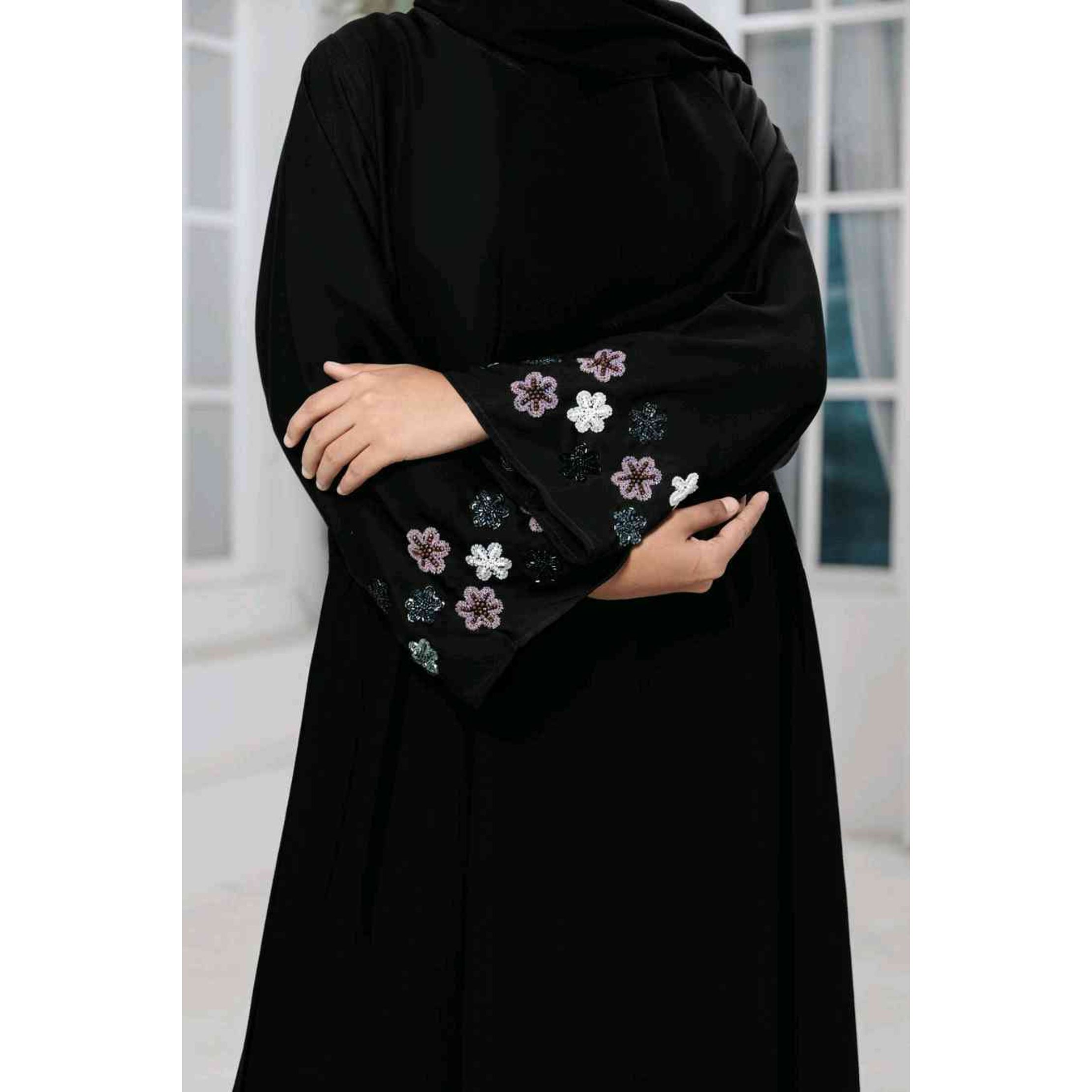 - A front open abaya with buttons with handwork on the sleeves